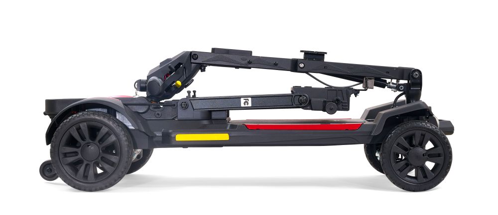 The Buzzaround CarryOn foldable scooter is small in stature and big on fun! This new sporty, super portable scooter will take you where you want to go in comfort and style! It features an infinitely adjustable tiller, full front and rear lighting package, 2 lithium-ion battery packs, included bottle and cane holders, and 300 lb. weight capacity. The heaviest piece is 47.5 lbs. (without seat and batteries) and the height when folded is only 12". This lightweight, folding mobility scooter disassembles easily into a few pieces and is designed to store in the smallest compartments. Pack your dreams and go anywhere with the CarryOn travel scooter!