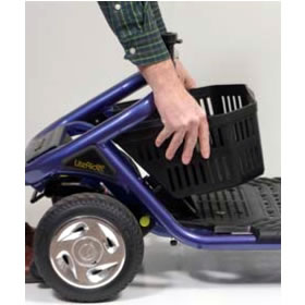 The four-wheel LiteRider scooter from Golden features 12.5-mile range, a Delta Tiller standard, more attractive styling and more vibrant colors. A modern tubular frame design supports its 300 lb. weight capacity, and its completely wireless disassembly makes transporting a breeze. The LiteRider GL141's 9-inch, black low-profile tires are mounted on high-strength steel rims. Its plush, deep-black vinyl stadium style seat comes with adjustable armrests and a full 360-degree swivel mechanism for getting on and off the scooter easily. You will also appreciate our two storage baskets, one on the tiller and one under the seat.